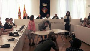 Jordi Manchón, coordinador del Vallès Occidental de Solidaritat Catalana per la Indepenpència, signa pel referèndum a Sant Cugat.