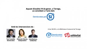 Aquest dissabte al vespre, a la Biblioteca Comarcal de Tàrrega, Elisenda Paluzie, Uriel Bertran i Toni Castellà presenten “Demòcrates pel SÍ”, la campanya per demanar el Sí en el referèndum sobre la independència de 2017, amb Demòcrates de Catalunya, independents i Solidaritat Catalana per la Independència.