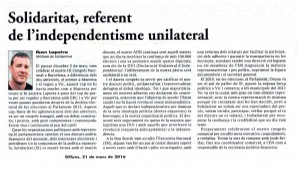 Quan les organitzacions polítiques amb representació parlamentaria canvien el seu discurs polític depenent del moment, dels interessos electoral i partidistes i/o la conjuntura de la política espanyola, Solidaritat (SI) es manté ferma amb el mateix discurs, el nostre ADN continua sent aquell mateix que un dia va merèixer la confiança de més 100.000 electors i ens va permetre assolir quatre diputats, som els de la DUI (Declaració Unilateral d’Independència) , l’alliberament de la nostra pàtria serà unilateral o no serà.