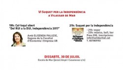 Aquest dissabte al vespre, a Vilassar de Mar es va celebrar el tradicional Suquet pe la Independència. L'acte, organitzat per la secció local de Solidaritat Catalana per la Independència, amb LluÃs Tenas al capdavant, va comptar amb nombrosa assistència, entre membres de SI de tot el territori i vilassarencs. Abans del sopar, Elisenda Paluzie, degana de la Facultat d'Economia i Empresa de la UB i una de les impulsores del Manifest pel Referèndum, va donar la conferència "Del RUI a la DUI, Independència 2017"... Llegir més